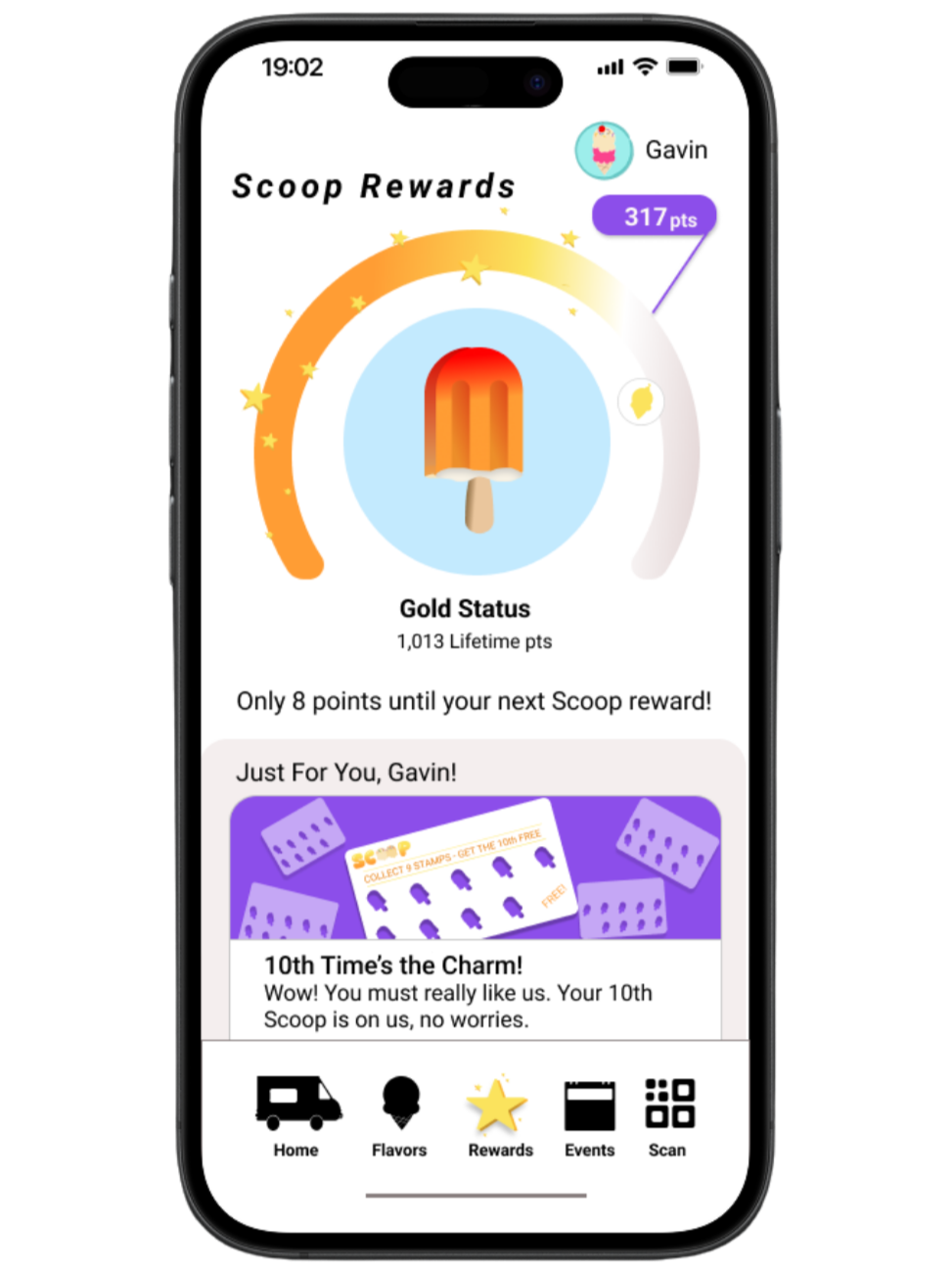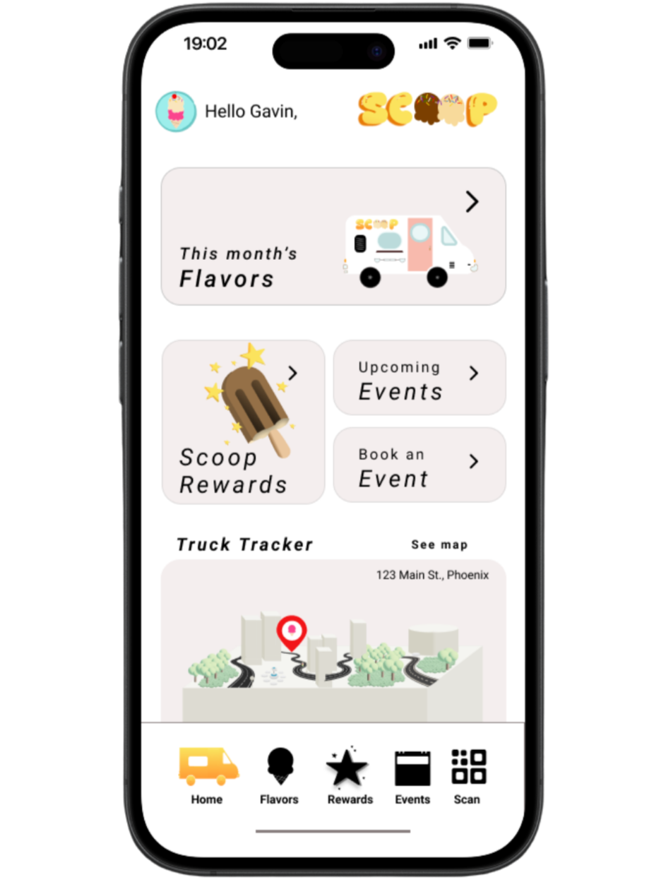 Scoop is a fictional Phoenix ice cream truck brand I created as a self-directed concept project to explore mobile UX design for a local small business. I designed an iOS app that lets customers track the truck in real time, browse flavors, earn rewards, and book private events. The design went through two rounds of high-fidelity iteration to solve real usability problems along the way.Problem Statement